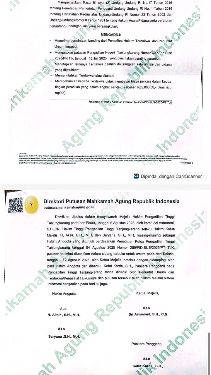 Karenanya majelis hakim tingkat banding berketetapan menguatkan putusan PN Tanjungkarang Nomor XXX/Pid.Sus/2025/PN Tjk tanggal 15 Juli 2025 yang dimintakan banding. Serta memerintahkan terdakwa tetap ditahan dan membebankan biaya perkara.