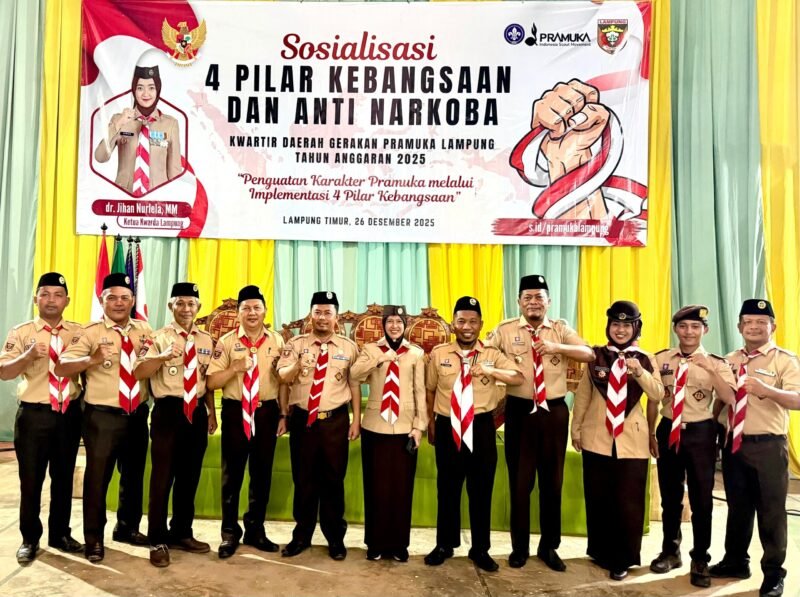 Kompastuntas.com, Lampung Timur — Kwartir Daerah (Kwarda) Gerakan Pramuka Lampung menggelar kegiatan Sosialisasi Empat Pilar Kebangsaan dan Anti Narkoba pada Jumat (26/12/2025) pagi. Kegiatan tersebut berlangsung di Aula SMK Ma’arif NU 1 Purbolinggo, Kabupaten Lampung Timur.