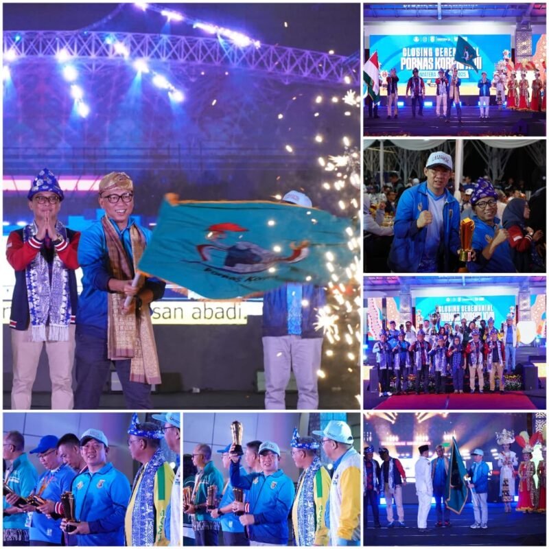 Kompastuntas.com, Palembang — Provinsi Lampung resmi ditunjuk menjadi tuan rumah Pekan Olahraga Nasional (Pornas) Korpri XVIII Tahun 2027. Penetapan ini ditandai dengan penyerahan pataka atau bendera estafet dari Gubernur Sumatera Selatan, Herman Deru, kepada Gubernur Lampung Rahmat Mirzani Djausal dalam upacara penutupan Pornas Korpri XVII di Palembang, Sabtu (11/10/2025).