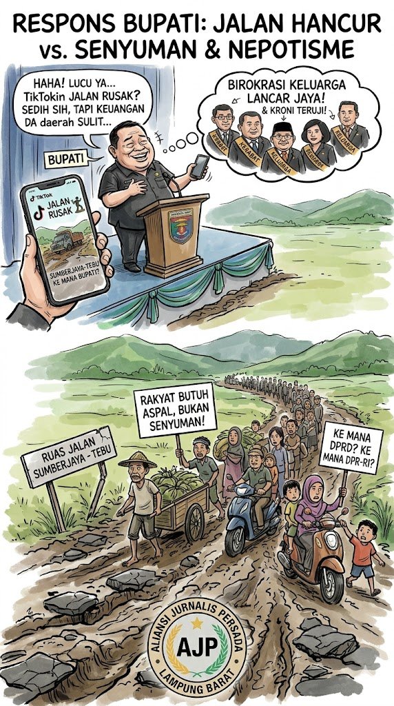 Pernyataan Bupati Parosil Mabsus yang mengaku “sedih sekaligus senyum-senyum” saat melihat keluhan warga di TikTok, alih-alih meredakan suasana, justru memantik amarah. Bagi Aliansi Jurnalis Persada Lampung Barat, respons itu bukan empati melainkan tanda jarak yang terlalu lebar antara penguasa dan yang dikuasai.