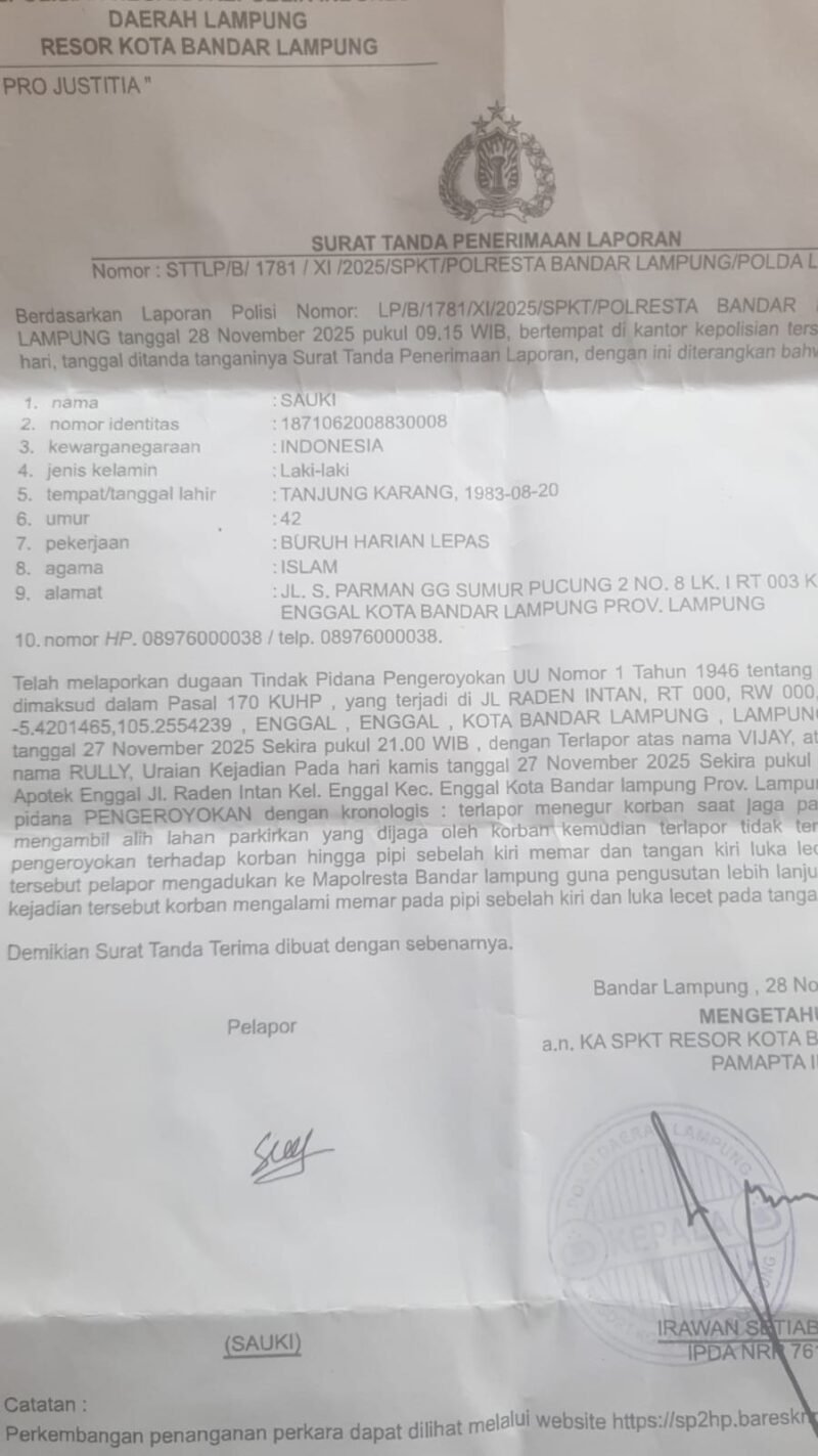 Peristiwa itu telah dilaporkan ke Polresta Bandar Lampung dengan nomor : LP/B/1781/XI/2025/SPKT/Polresta Bandar Lampung/Polda Lampung/ Tertanggal 27 November 2025.