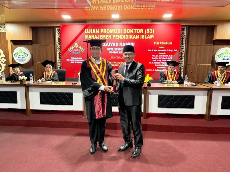 Kompastuntas.com— Kedaton, Zaiyad Namiri resmi menyandang gelar doktor sebagai lulusan ke-424 Program Pascasarjana UIN Raden Intan Lampung. Gelar itu ia peroleh setelah mempertahankan disertasinya dalam sidang terbuka Program Doktor (S3) Manajemen Pendidikan Islam yang digelar pada 27 April 2026.
